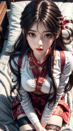 1girl, long hair, thighhighs, lying, perfect body, scenery, sharp focus, best quality, masterpiece, detailed outfit, illustration, perfect eyes, finely detailed beautiful anime eyes, realistic skin, intricate details, best lighting, depth of field, ultra high resolution, bed, from above