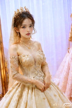 Ultra-clear 8k, real, night, smile, crown, necklace, perspective, hanger, wedding studio, nudity, diamonds, lots of dresses around, jy, bridal veil, Golden wedding dress, 1 girl, Asian girl, wedding dress