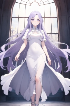 masterpiece,best quality,highres. 1girl,solo,very long hair,light purple hair,swept bangs,purple eyes,white dress,long dress,floating hair,short sleeves,large breasts,castle,standing,<lora:lbc_quinella_(sao)24324_v1.0:0.8>,