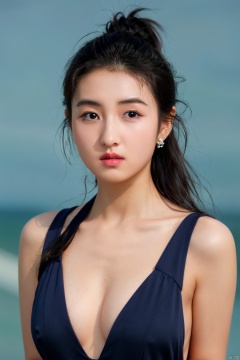 1girl, cleavage,hug breasts,Breast lateral leakage,earrings, solo, Low cut evening gown,jewelry, blue_background, realistic, upper_body, sleeveless, lips, long_hair, brown_eyes, big breasts, evening dress, looking_at_viewer, nose, black_hair,
