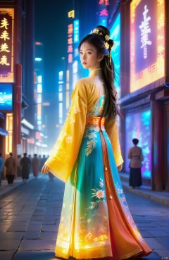 1girl, solo, long hair, neon lights, full body, night, citA young girl dressed in traditional Hanfu attire finds herself standing on a street lined with neon lights, her figure seemingly illuminated from within against the technicolor glow. Behind her looms a massive holographic display screen, casting a futuristic contrast against her ancient garb. The fusion of old and new, East and West, creates an enchanting visual spectacle where tradition meets modernity. Her elegant silhouette, adorned with intricate patterns and flowing fabric, holds a captivating presence amidst the pulsating energy of the city nightlife., 1girl<lora:EMS-329777-EMS:0.600000>, <lora:EMS-317135-EMS:0.600000>, <lora:EMS-322155-EMS:0.300000>