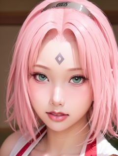 masterpiece,soft light and shadow,1girl,haruno sakura,solo,looking at viewer,short hair,bangs,green eyes,beautiful big eyes,eyelash,collarbone,pink hair,parted lips,japanese clothes,teeth,blurry,blurry background,portrait,forehead mark,realistic,nose,<lora:lbc_haruno_sakura_240324_v1.0-000010:0.9>,