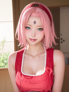 masterpiece,soft light and shadow,1girl, haruno sakura, solo, looking at viewer, smile, short hair, bangs, bare shoulders, closed mouth, green eyes, collarbone, upper body, pink hair, sleeveless, parted bangs, sleeveless shirt, forehead mark, red hairband<lora:lbc_haruno_sakura_240324_v1.0-000010:0.9>,