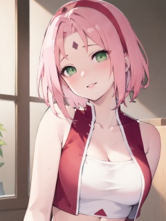 masterpiece,highres,1girl, haruno sakura, solo, looking at viewer, blush, smile, short hair, bangs, bare shoulders, medium breasts, green eyes, collarbone, upper body, pink hair, sweat, parted lips, sleeveless, shiny, indoors, crop top, shiny skin, parted bangs, zipper, forehead mark, red hairband, taut clothes, realistic,<lora:lbc_haruno_sakura_240324_v1.0-000012:0.9>,