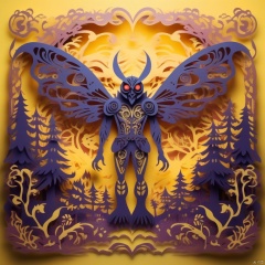 paper-cut of a mothman with ominous presence in an vibrant colored enchanted wonderland, magical, whimsical, fantasy art concept, steampunk, intricate details, best quality, masterpiece, ultra sharp, yellow theme background,