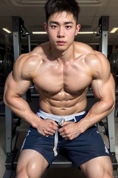 realistic,master piece,high resolution, handsome ,1boy,20y.o,topless.,sitting ,hands on waist ,in gym,a smaller head,ttboy