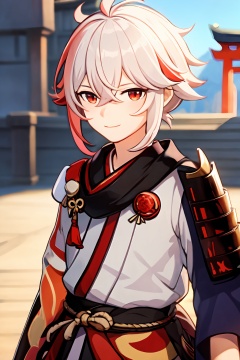 masterpiece,best quality,light,outdoors,landscape,depth of field,kaedehara kazuha,1boy,male focus,solo,red eyes,multicolored hair,bangs,streaked hair,japanese clothes,(red hair:1.3),hair between eyes,looking at viewer,smile,armor,bandages,japanese armor,<lora:kazuha:0.8>,, light,outdoors,landscape,depth of field,