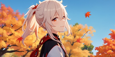 masterpiece,best quality,absurdres,mid_shot,solo,(from side, upper body:1.4),anime screencap,in autumn,sunset,outdoors,maple forest,maple leaves falling,kaedehara kazuha,1boy,male focus,solo,standing,back lighting,looking at viewer,red eyes,multicolored hair,white hair,bangs,streaked hair,red hair,short ponytail,perfect face,eyelashes,very beautiful eyes,stars in the eyes,light smile,hair between eyes,closed mouth,<lora:kazuha:0.7>,
