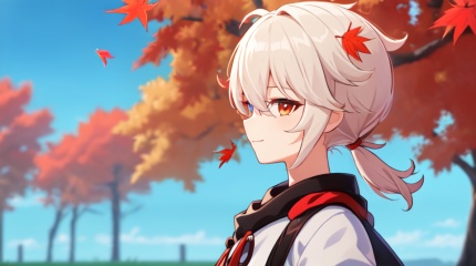 masterpiece,best quality,absurdres,(upper_body:1.4),(from side:1.4),anime screencap,in autumn,sunset,outdoors,maple forest,maple leaves falling,kaedehara kazuha,1boy,male focus,solo,standing,looking at viewer,short hair,multicolored hair,white hair,bangs,streaked hair,red hair,short low ponytail,perfect face,red eyes,eyelashes,very beautiful eyes,stars in the eyes,light smile,hair between eyes,closed mouth,<lora:kazuha:0.8>,