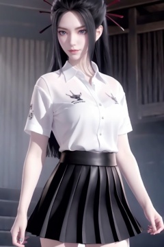 1 girl,black hair,Blue eyes,medium breasts,(white Shirt dress:1.3)and(black pleated skirt:1.3),break,light smile,standing,solo,,<lora:fb793ff6632ce98f34c43b74eee0ddb1e403d9ac4652e2e712f4bd73ad3e7241:0.6>