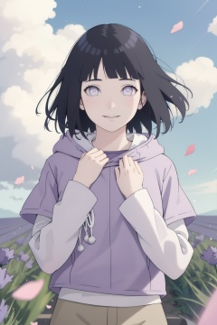 masterpiece,absurdres,hinata\(boruto\),1girl,solo,mature female,purple hoodie,layered sleeves,brown pants,outdoors,lavender flower field,wind,floating hair,hand on own chest,looking at viewer,smile,(falling petals),cloudy sky,<lora:lbc_Hyūga Hinata_Naruto24324_v1.0:1>,