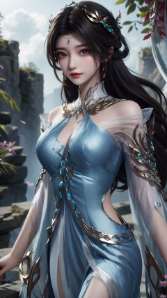 1girl, solo, dress, blue dress, black hair, hair ornament, jewelry, earrings, long hair, looking at viewer, mischevious smile, perfect body, scenery, sharp focus, best quality, masterpiece, detailed outfit, illustration, perfect eyes, finely detailed beautiful anime eyes, realistic skin, intricate details, best lighting, depth of field, ultra high resolution,cowboy_shot, dynamic pose, dynamic angle,