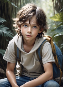 In a realistic style, depict a young boy with a sense of wonder and adventure. With tousled hair and bright eyes, he exudes a playful energy. The boy is dressed in casual attire, ready for exploration and discovery. Whether he's wearing a t-shirt and shorts or a hoodie and jeans, his clothing reflects his adventurous spirit. Against a simple background, the focus remains on the boy and his vibrant personality. This realistic portrayal captures the essence of childhood curiosity and invites viewers to imagine the exciting journeys that lie ahead for this young adventurer.