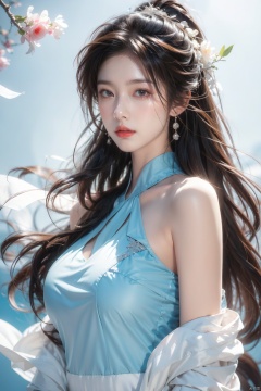 illustrator, anime, realistic, 1girl, lip, dress, order, blue gradient background, long hair,(masterpiece, best quality),large breasts
