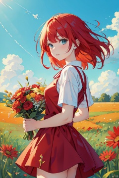 illsutration of girl with bright red hair, wearing a sundress and holding a bouquet of wildflowers, standing in a field of tall grass with a soft breeze blowing through, close up. BREAK, the scene should capture the whimsical and carefree style of Sakimichan, with a sense of peace and tranquility in the air.