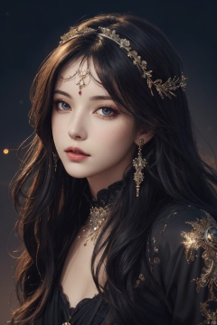 official art,beautiful and aesthetic,1girl,long hair,beautiful face,detailed eyes,colorful,jewelry,night,(realistic:1.5),extreme detailed,(fractal art:1.3),witch, half body,from front