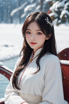 a girl for cgart_mayfly\(model\) test, in (pure white:1.5) dress, long hair cascading over her shoulders, winter hanfu, fur collar,(looking_at_viewer),smile. BREAK, adorned with a golden headband on her hair, which shone even more brilliantly in the snow. Her attire was like that of a fairy woman. she was only around 15 or 16 years old, with skin as white as snow, delicate and beautiful beyond words. BREAK,Snow, Edge lighting, the traditional Chinese boat, 35mm photograph, shot by Leica M50 f/2.8
