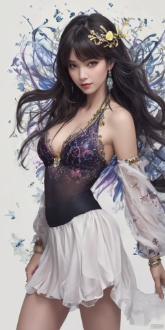 (1girl:1.2),Chinese girls,stars in the eyes, (Short skirt:1.4),(1girl:1.3),Masterpiece, high quality, 1girl, extreme detailed, (fractal art:1.3), colorful, highest detailed, (chiffon, body painting:1.2), 8k, digital art, macro photo, quantum dots, sharp focus, dark shot, cinematic, Microworld, thigh, (upper thighs shot:1.2), front view,(pure girl:1.1),(white dress:1.1),(full body:0.6),There are many scattered luminous petals,bubble,contour deepening,(white_background:1.1),cinematic angle,,underwater,adhesion,green long upper shan, 21yo girl,jewelry, earrings,lips, makeup, portrait, eyeshadow, realistic, nose,{{best quality}}, {{masterpiece}}, {{ultra-detailed}}, {illustration}, {detailed light}, {an extremely delicate and beautiful}, a girl, {beautiful detailed eyes}, stars in the eyes, messy floating hair, colored inner hair, Starry sky adorns hair, depth of field, large breasts,cleavage,blurry, no humans, traditional media, gem, crystal, still life, Dance,movements, All the Colours of the Rainbow,halo,cable,realistic,smile,hair ornament,zj,