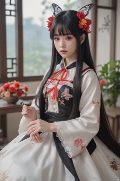 HUBG_Rococo_Style(loanword), 1girl, solo, Chinese clothes, long hair, butterfly, pale skin, bug, black hair, Hanfu, hime cut, bangs, bracelet, blunt bangs, jewelry, red eyes, (flower Theme),cowboy shot, (alive skin)
