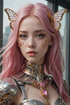 art of a beautiful 1girl cyborg with long pink hair, futuristic, scifi, intricate, elegant, highly detailed, majestic, the painting with a unique combination of realism and abstraction, surreal gold filigree, broken glass, (masterpiece, sidelighting, finely detailed beautiful eyes: 1.2), hdr, realistic painting, natural skin, textured skin, closed mouth, crystal eyes, butterfly filigree, chest armor, eye makeup, robot joints, long hair moved by the wind, window facing to another world,
