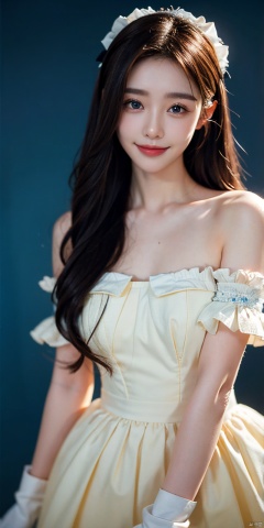 (Good structure), DSLR Quality,Depth of field,kind smile,looking_at_viewer,Dynamic pose,,,Realistic, artwork, final detail, photo Realistic, intricate detail, octane rendering, 8K, 1 girl, , perfect face, pretty face, nswf, reference, hair detail,, black bow, black gloves, black legs, blue eyes, blue hair, bow, collarbone, dress, sticking hair, ruffles, ruffles, gloves, gwen, headdress, high resolution, long hair, parted lips, puffed sleeves, purple eyes, smile, alone, white dress, oily skin, lianmo, ((poakl)), 1girl