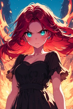 1girl, solo, red hair, long hair, dress, fire, looking at viewer, black dress, floating hair, serious, blue eyes, breasts, frown, closed mouth, v-shaped eyebrows, collarbone, short sleeves, glowing, aqua eyes,angry