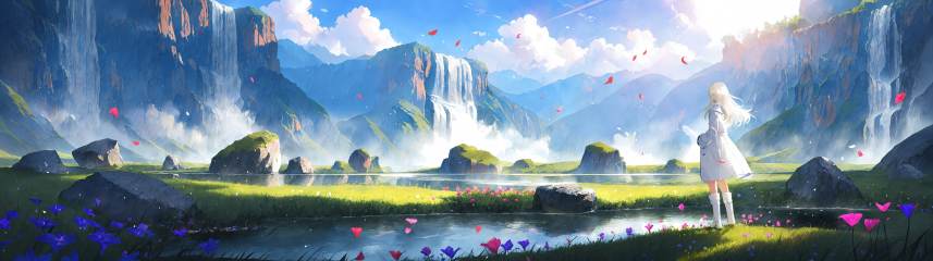 incredibly_absurdres,(ray tracing),light particle,((solo:1.8)),(1girl:1.5),((a beautiful girl)),(((full body shot))),((standding)),((hand in pockets)), (facing away),(((white coat))),((beautiful white dress+white knee boots)),((Belts)),(leg loops),(((long white_hair))),((beautiful sky)),(scenery),((grassland)),((mountain)),((canyon)),((waterfall)),(cloud),((nature)),(grass),((fog)),(flower),(stone),(rock),(sunlight),(wind),(petal),lake,reflection