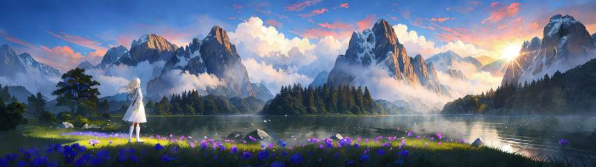((best quality)), ((masterpiece)), ((ultra-detailed)), (illustration), (detailed light), (an extremely delicate and beautiful),incredibly_absurdres,(ray tracing),light particle,((solo:1.8)),(1girl:1.5),(standding),((a beautiful girl)),(((full body shot))),((standding)),(facing away),((beautiful white dress+white knee boots)),((Belts)),(white scarf),(leg loops),(((long white_hair))),((beautiful sky)),(scenery),((flower meadow)),((mountain)),(cloud),((nature)),(grass),((fog)),(flower),(stone),(rock),(sunlight),(river),(lake)