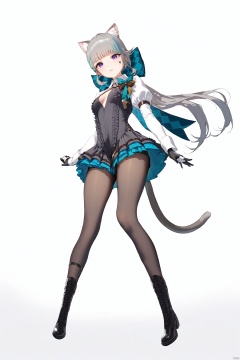 lnt, def clothe, car ears, 1girl,cat tail,pantyhose,black boots, purple eyes, black gloves, cross-laced footwear, grey hair, multicolored hair, puffy sleeves,