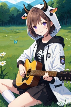 loli,petite,male_focus, bug, butterfly, brown_hair, jacket, animal_ears, instrument, gloves, grass, horns, fingerless_gloves, sitting, solo, guitar, purple_eyes, shirt, cow_boy, cow_horns, white_butterfly, cow_ears, white_gloves, outdoors, white_jacket, acoustic_guitar, black_shirt, looking_at_viewer, hooded_jacket, bag, short_hair, smile, socks, holding