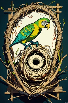 Rainforest,gold steel parrot,(Sophisticated and beautiful nest:1.5),branches,green leaves,Colorful flowers and diverse plants, graffiti in the style of Keith Haring,sharpie illustration, Bold lines and solid colors, Simple details, minimalist, peaceful light