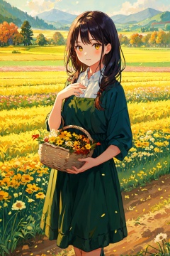 a girl standing in the field,holding a basket in one hand,the other hand waving in the air to say hello,1 girl,autumn,field,flower field,grass,nature,outdoor,solo,rice,mature rice,harvest,yellow theme. beautiful background,bichu,oil painting,Impressionism