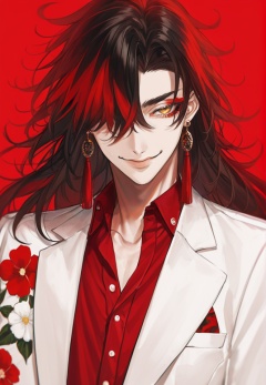 (best quality), ((masterpiece)), (highres), illustration, original, extremely detailed,   <lora:邪恶美学:0.7>1boy, male focus, virtual youtuber, red hair, solo, black hair, red background, jewelry, multicolored hair, earrings, shirt, yellow eyes, floral print, smile, hair over one eye, red shirt, looking at viewer, jacket, long hair, single earring, upper body, collared shirt, one eye covered, simple background, red eyeshadow, tassel earrings, white jacket, bangs, tassel, makeup, eyeshadow, closed mouth, signature