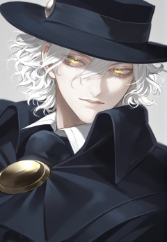 (best quality), ((masterpiece)), (highres), illustration, original, extremely detailed,   <lora:邪恶美学:0.7>solo, 1boy, male focus, edmond dantes \(fate\), hat, yellow eyes, white hair, looking at viewer, black headwear, simple background, hair between eyes, fedora, wavy hair, bangs, upper body