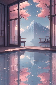 (\wei lai de jia\), tree, no humans, window, scenery, cloud, sky, reflection, water, petals, indoors, mountain, leaf, autumn leaves, outdoors, building, day, blue sky, cherry blossoms