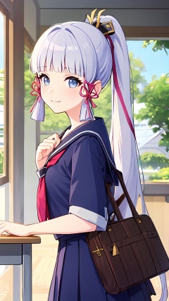 masterpiece,high quality,best quality,hires,ayaka,kamisato ayaka,1girl,solo,bangs,blunt bangs,sidelocks,long hair,hair ribbon,ponytail,hair ornament,grey eyes,tress ribbon,ribbon,<lora:ayaka:0.7>,serafuku,perfect face,very beautiful eyes,stars in the eyes,eyelashes,looking at viewer,blush,smile,standing,from side,classroom,school_desk,school_bag,book,book_stack,