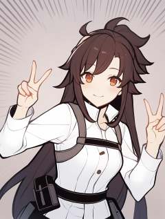 1girl, 1girl, fujimaru ritsuka \(female\) \(polar chaldea uniform\), fate/grand order, solo, white shirt, upper body, black hair, red eyes, shirt, long hair, looking at viewer, smile, collared shirt, blush, simple background, v, buttons, double v, white background, closed mouth, long sleeves, masterpiece, best quality, safe <lora:mki-genshinpv-xl-v1-000012:1>