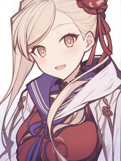 1girl, 1girl, miyamoto musashi \(swimsuit berserker\) \(third ascension\) \(fate\), fate/grand order, solo, blonde hair, serafuku, low twintails, school uniform, twintails, hair ornament, upper body, looking at viewer, long hair, open mouth, blush, smile, sailor collar, simple background, yellow eyes, white background, jacket, long sleeves, masterpiece, best quality, safe <lora:mki-genshinpv-xl-v1-000012:1>