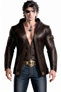 ((HRD, HUD, 8K)),((masterpiece, best quality)), highly detailed, soft light,1boy, solo, black hair, brown eyes, eyepatch, scar, scar on face,necklace, jewelry, muscular, (hoodie:1.2),simple background, white background, cowboy shot, standing, looking at viewer, <lora:20240325-1711375441925:0.68>