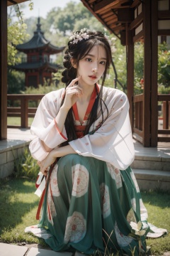 <lora:GoodHands-手beta2:1>,solo,1girl,cowboy shot,<lora:0364 Green floral Hanfu_v1-000003:0.9>,ruanyi0364,chinese clothes,dress,hanfu,outdoors,Chinese ancient pagoda,squatting,full frontal,, (incredibly absurdres, ultra-detailed,CG ,unity ,8k wallpaper),(masterpiece),(realistic),(photorealistic:1.2),(raw photo:1.2), (best quality:1.2), (detailed face :1.4),(beautiful detailed eyes :1.2),(detailed hair),light on face, huge filesize ,cinematic lighting, 1 girl ,sexy,