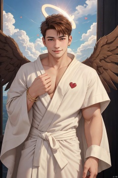 Photo of a man wearing cupid costume,(brown hair),wings,flying,halo,(white toga robe),armor,(surrounded by clouds),ethereal,(seductive smile:0.6),jewelry,heart,best quality,extremely detailed,intricate details,male focus,