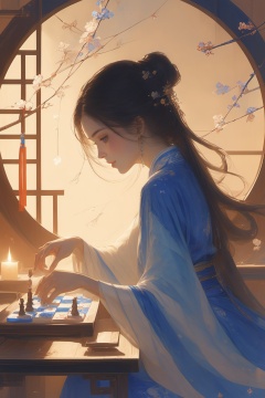 1girl,long hair,solo,jewelry,earrings,sitting,board game,flower,circular window,window,dress,chinese clothes,from side,hair ornament,hair bun,long sleeves,blue dress,black hair,table,indoors,looking down,hanfu,single hair bun,profile,brown hair,candle,light,GFGF