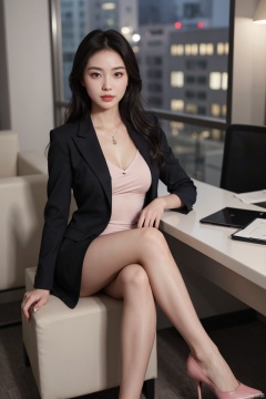 1girl,fashion model,female focus,asian,pretty,Charming eyes,exquisite facial features,pink lips, very delicate skin, open_blazer,pantyhose,high heels,night,Soft lighting,in office,city,full shot,blurry,(masterpiece, realistic, best quality, highly detailed, profession),plns