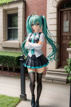 ((HRD, HUD, 8K)),((masterpiece, best quality)), highly detailed,1girl, hatsune miku, solo, long hair, twintails, window, holding, shirt, very long hair, plant, holding book, book, white shirt, skirt, outdoors, railing, stairs, looking at viewer, green eyes, smile, aqua hair, aqua eyes, long sleeves, bush, standing, crossed arms, blue skirt, green hair, hair between eyes, building,