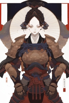 warrior, armor, 1girl, solo, straight-on, white background, shoulder armor, japanese armor, looking at viewer, black hair, gauntlets, simple background, blue eyes, japanese clothes, breastplate, pauldrons, faulds, updo,