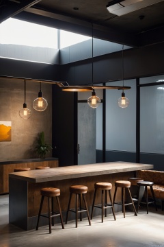 Exposed ductwork, concrete floors, metal beam ceilings, open plan, large factory windows, leather and metal furniture, Edison bulb lighting, minimalist artwork, sleek bar stools.\(设计理念:通过展露原始材料和结构,创造出一个充满都市感和艺术氛围的空间, by Ethan\)<lora:EMS-317795-EMS:0.800000>