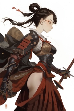 warrior, 1girl, weapon, solo, sword, armor, black hair, white background, hip vent, from side, breasts, japanese clothes, simple background, hakama, profile, gauntlets, looking at viewer, long hair, hair rings, holding, standing, japanese armor, medium breasts,