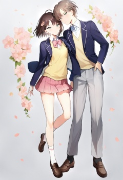 best quality, masterpiece,1girl, 1boy , skirt , brown hair , shoes, school uniform, white background , blue eyes, jacket, hair ornament, simple background , green eyes, blazer, pleated skirt, looking at viewer, ahoge, socks, full body, pants , loafers, sweater vest, short hair, brown footwear, open clothes tie, pink skirt, long sleeves, shirt, miniskirt, open jacket, flower, plaid, hair flower, bangs, pink bow ,_背景<lora:lpmyaXLlokr4f-000143:1>