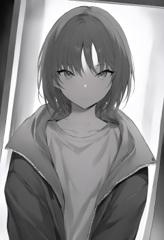 best quality, masterpiece,1girl, greyscale, monochrome, solo, looking at viewer, bangs, closed mouth, upper body, jacket ,_背景<lora:lpmyaXLlokr4f-000143:1>