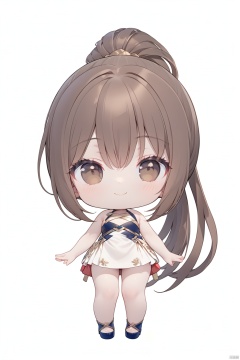 1 girl, brown eyes, brown hair, looking at the audience, ponytail, chibi, simple background, smile, long hair, (masterpiece), (best quality), (super detailed), (whole body: 1.2),full_body<lora:EMS-331566-EMS:1.000000>